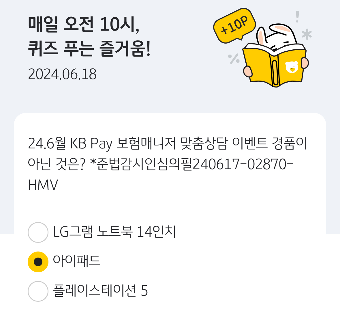 KB국민카드 KB Pay(구-리브메이트) 앱에서 이벤트로 '오늘의 퀴즈'가 진행 중이다.